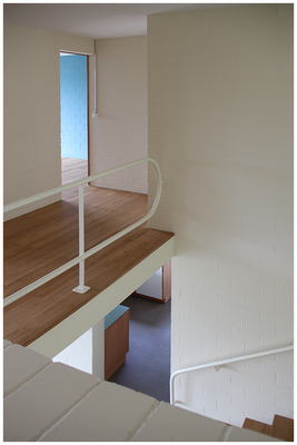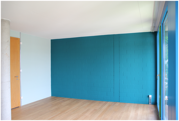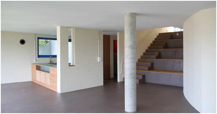 Der durchaus zeittypische Ausdruck der Innenräume mit dem rohen Sichtmauerwerk aus Kalksandstein, dem rustikalen Bodenbelag aus roten Tonplatten und den intensiven Primär- und Sekundärfarben der raumhohen Fenster und der elektrischen Aufputzleitungen wirkten für heutige Verhältnisse roh und karg. Ziel war es eine freundliche, wohnliche Atmosphäre zu schaffen ohne den eigenständigen Charakter des aussergewöhnlichen Hauses und seiner Räumlichkeiten zu verändern.