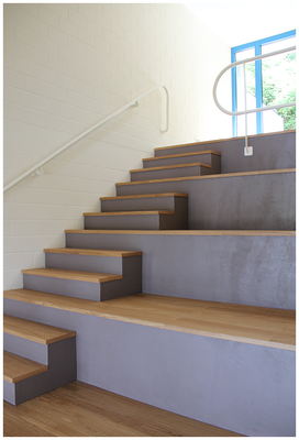 Um die Wände mit ihrem prägnanten Fugenbild optisch zu beruhigen wurden die rohen Kalksandsteinwände deckend gestrichen. Die dunkle, rustikale Holztäferdecke wurde durch einen glatten Weissputz ersetzt. Als Bodenbelag wurde für das untere Wohngeschoss ein fugenloser Spachtelbelag und für das obere Schlafgeschoss ein geölter Massivholzparkett aus Eiche gewählt. Beim eigentlichen Herzstück, der etagenverbindenden Treppenanlage, verbinden die Bodenbeläge in adäquater Weise die beiden Etagen.