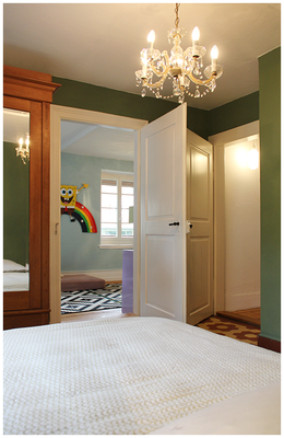 Der Typologie des ortstypischen Bauernhauses entsprechend, sind die Räume im massiven Wohnhausteil von unterschiedlicher Grösse und Qualität; von klein, niedrig und dunkel im Erdgeschoss bis – verhältnismässig – grosszügig, hoch und hell im oberen Geschoss. Durch die pragmatische Anordnung der Räume und Durchgänge ergeben sich Raumabfolgen mit spannenden Sichtbezügen.