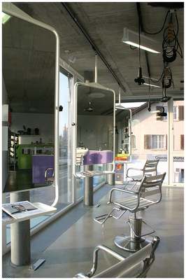 Besondere Aufmerksamkeit beim Entwurf des Salons galt der Organisation optimaler Abläufe für das Personal und für die Kundschaft. Daraus ergab sich das Konzept eines offen gestalteten Grundrisses, der es der arbeitenden Person jederzeit erlaubt mit der Kundschaft zu kommunizieren. Die Idee des offenen Grundrisses unterstützt die Qualität des lichtdurchfluteten Raumes mit der grosszügigen Fensterfront zur Strasse.