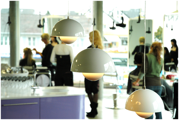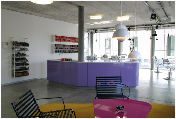 Zwischen kurzen Verkehrswegen entstanden Zonen, deren Funktionen auch in der Gestaltung sichtbar sein sollten. Eigens für diesen Salon gestaltetes und in hoher Qualität verarbeitetes Mobiliar in frischen, lebhaften Farben, kombiniert mit Designerstücken aus dem Handel, stehen in spannendem Kontrast zum industriellen Charakter der Frisierplätze.