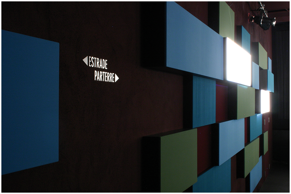 Die eigens für das Projekt entwickelte, textilbespannte Wandverkleidung in Form von rechteckigen Kisten, angeordnet in verschiedenen Tiefen, übernimmt mehrere Funktionen: Sie dient als Akustik-Absorber, nimmt Raumbeschallung und Saalbeleuchtung auf und wird zum prägenden gestalterischen Element im Raum.