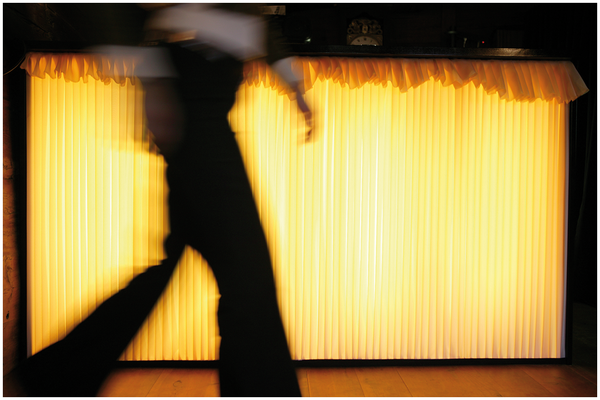 Durch eine Schleuse aus schwarzem Vorhang wurde der Besucher direkt ins Zentrum der Lounge geführt. Dieser schmale, dunkle Zugang verstärkte das Gefühl des Eintauchens und gliederte den Raum in verschiedene Nutzungsbereiche. Die Farben der Walliser Sonntagstracht prägten die Stimmung des Raums; Schwarz und Perlweiss im gedämpften Licht der Tischleuchten, ergaben eine stimmungsvolle Atmosphäre, die zum Verweilen und Ausruhen einlud.